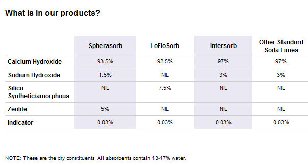 LoFloSorb™’s chemical formulation has been developed to provide CO2 absorption without the need for any alkali hydroxide. It provides complete protection against the potential problems of use within the medical environment. LoFloSorb™ offers excellent CO2 absorption, however, its duration of use will be less than Spherasorb™ or Intersorb Plus.
